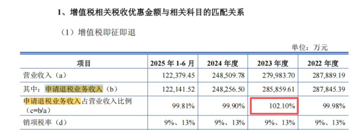 值得一提的是,公司的盈利质量严重依赖税收优惠。2022年至2024年,公司享受的税收优惠占净利润比重从63.02%飙升至80.58%。这意味着,2024年其超过八成的净利润来源于税收返还。更令人费解的是,公司2023年用于申请退税的业务收入高于当期账面营业收入。