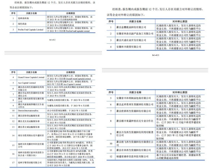 值得一提的是,报告期内,林平发展突击注销多达17家关联方,包括宿州森林海、绿色纸业、萧县浩功再生资源回收利用有限公司、萧县有运再生资源回收有限责任公司等。其注销原因包括“因发行人终止筹划境外上市,拆除红筹架构”、“为避免及规范关联交易”、“发行人2023年终止向其采购后无实际经营业务”等。